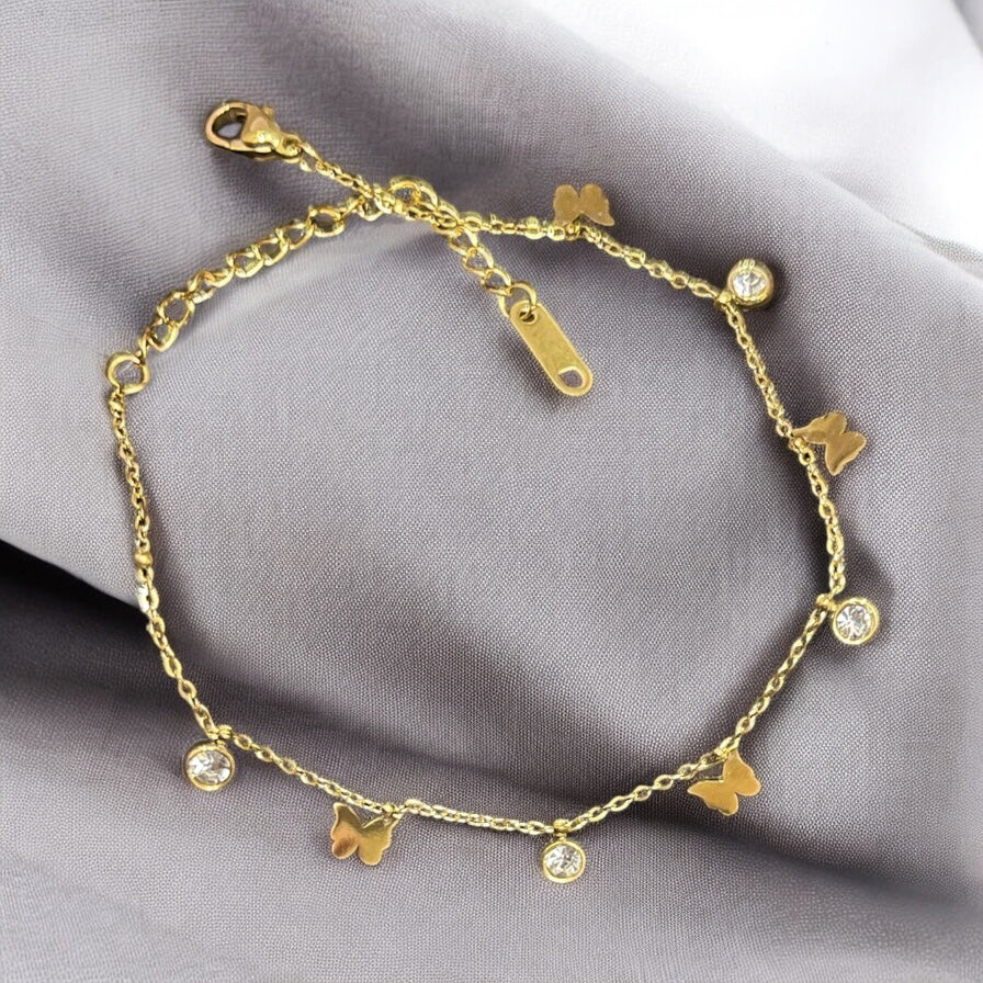 Description: Let your elegance take flight. This delicate chain bracelet features glimmering diamond accents and butterfly charms, capturing grace and light in every flutter. Perfect for stacking or solo wear.