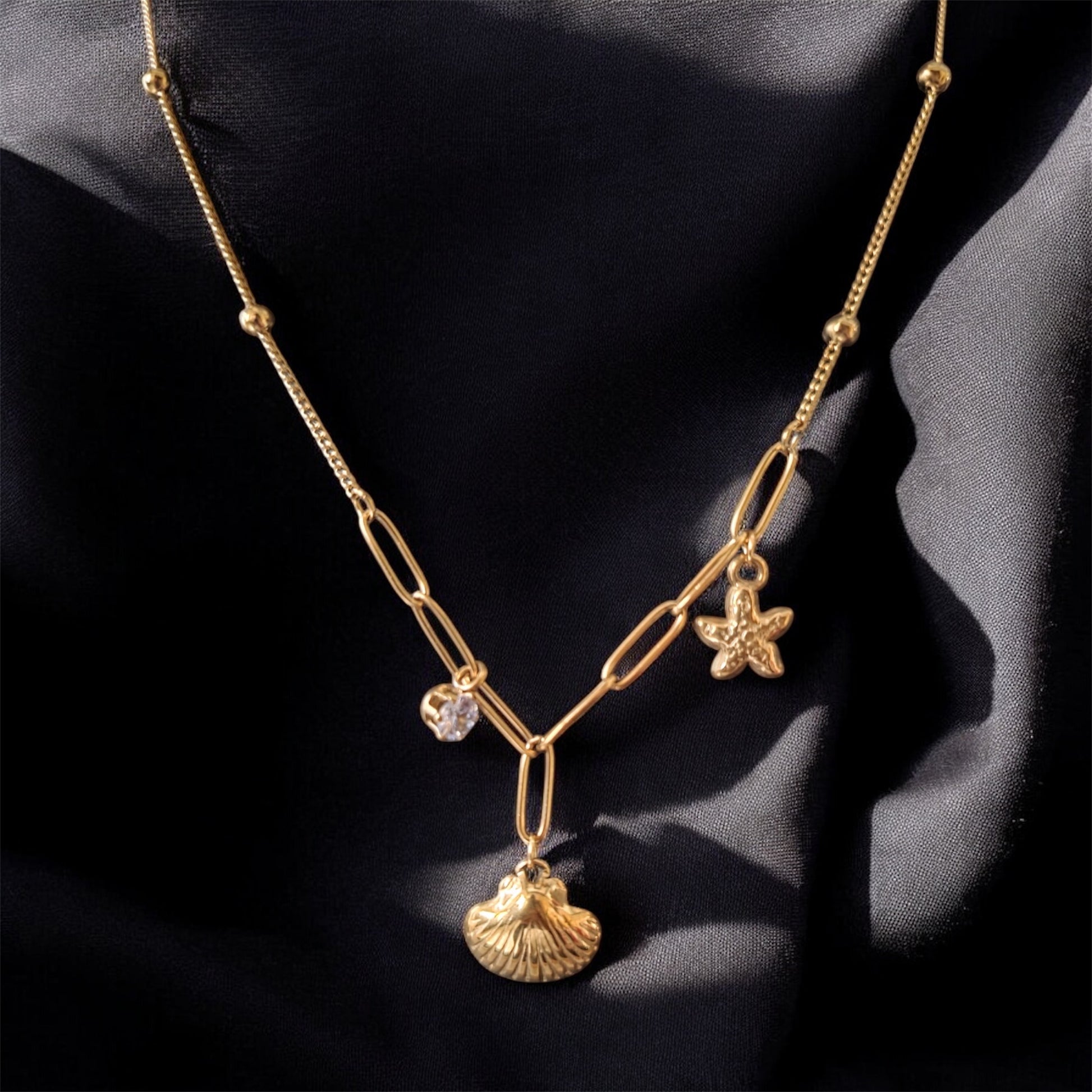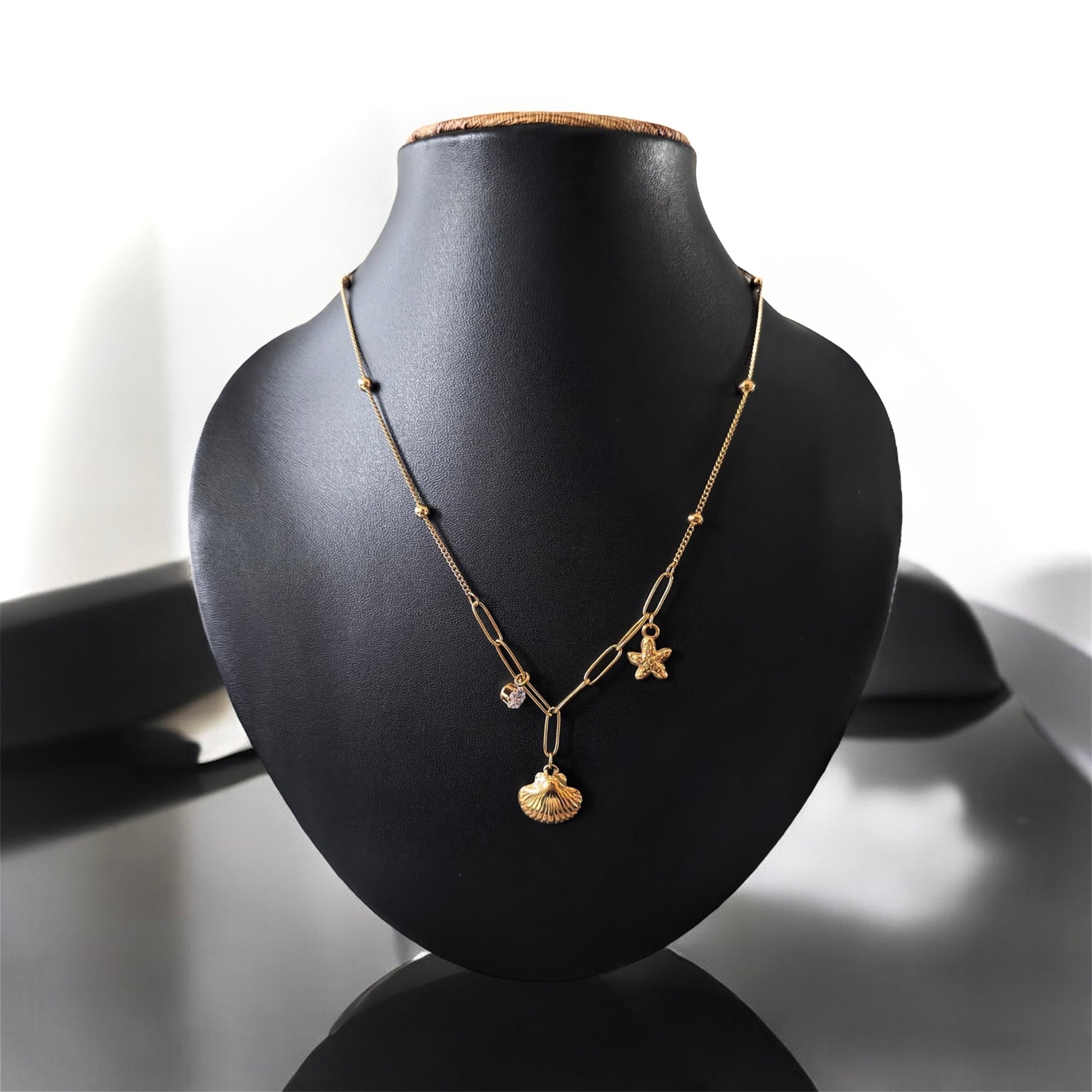 Description: Echoing the shimmer of sunlit waters and the quiet treasures of the shore, Coastal Mirage features delicate shell, diamond, and starfish charms along a double-strand chain. It’s the perfect mix of light, luxury, and laid-back sophistication.