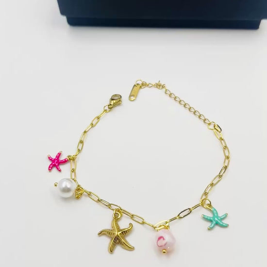 Description: Bring beachy vibes to your everyday style with our premium quality anti-tarnish Ocean Charm Bracelet. Designed with a bold link chain and adorned with colourful starfish charms and elegant pearls, this piece is the perfect blend of playful and classy.