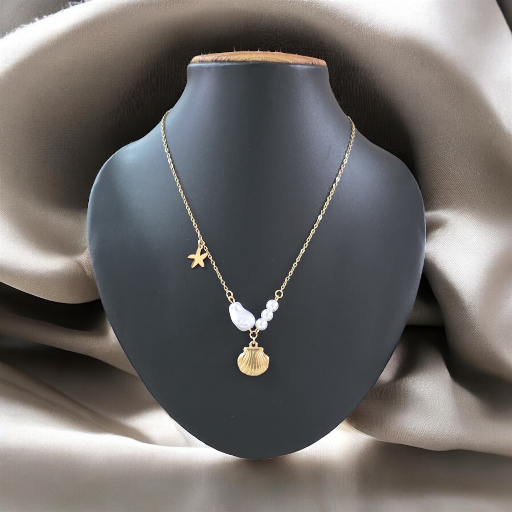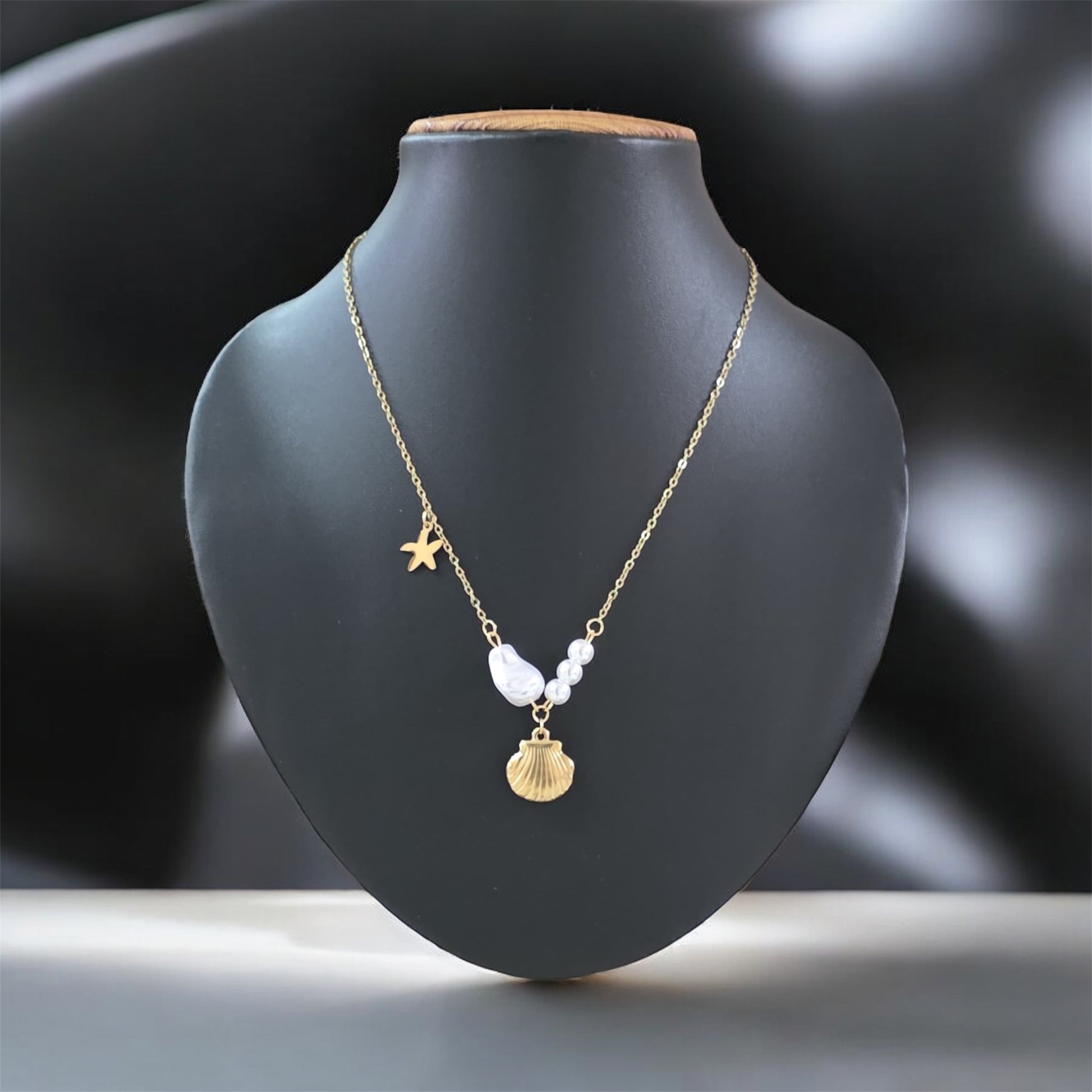 Description: Crafted for the modern dreamer, Ocean Muse blends the shimmer of pearls with the playful spirit of starfish and the natural beauty of seashells. A delicate piece that turns everyday moments into coastal escapes.