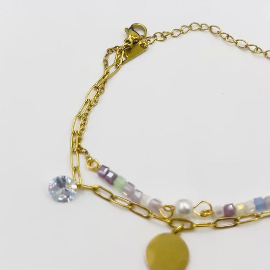Description: Elevate your everyday jewellery game with our premium quality anti-tarnish Pastel Charm Bracelet, designed for girls who love soft, elegant, and trendy pieces. Featuring a dual-chain design with delicate pastel beads, shimmering crystal drops, a mini pearl, and a sleek gold charm, this bracelet adds the perfect touch of subtle luxury to any outfit.