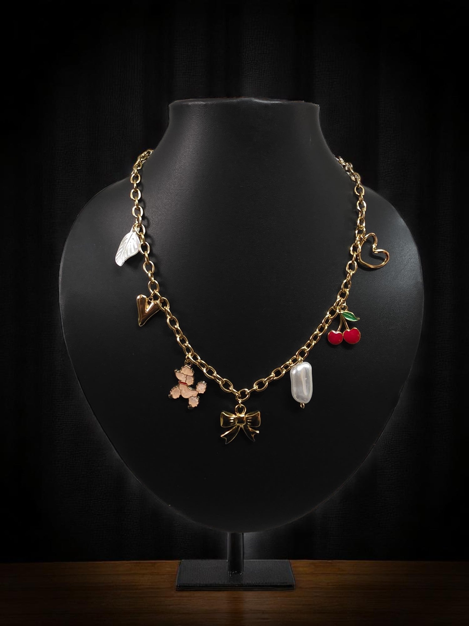 Let this charm chain be the hero—layer it over a clean white tee or a soft pastel dress. For a co-ordinated look, pair it with mini heart or cherry studs and keep other accessories minimal.