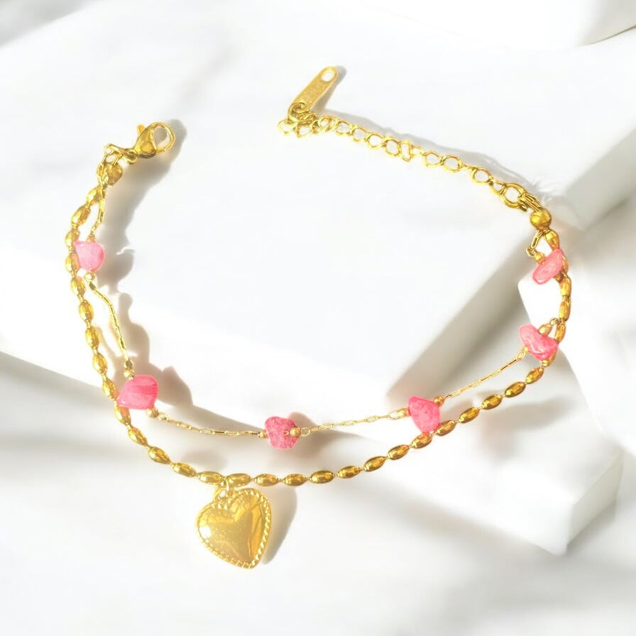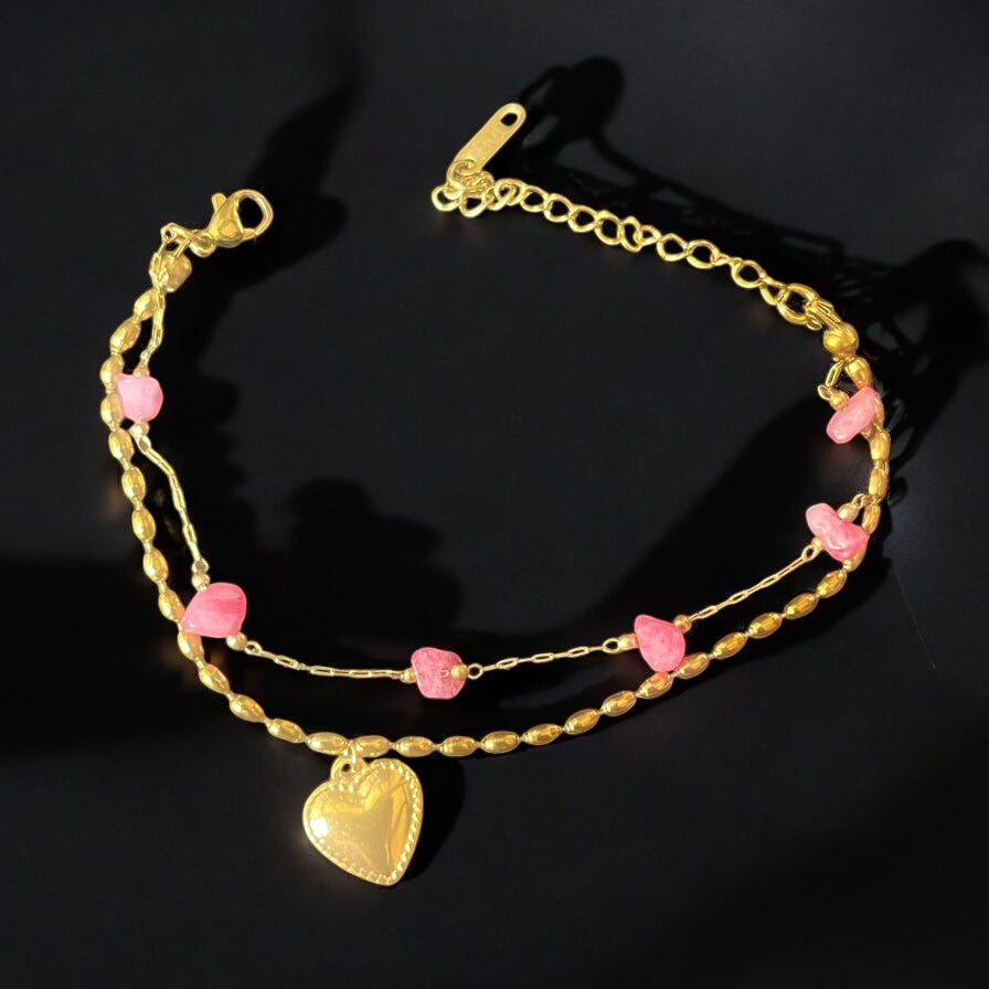 Description: Delicate yet dreamy, the Rose Whispers bracelet features a soft string of baby pink crystals paired with a sleek gold chain. A dainty heart charm at the center adds a romantic finish — perfect for everyday wear or thoughtful gifting.