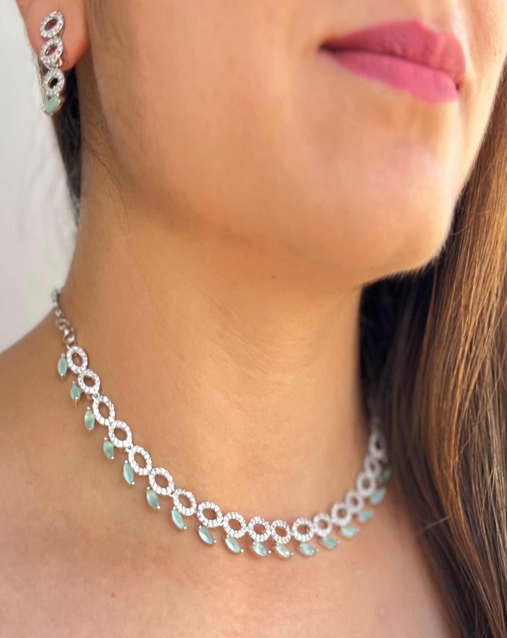 Description: Our Silver Small Oval AD (American Diamond) Neckpiece and Earrings Set brings timeless elegance to your wardrobe. The set includes a sparkling Neckpiece and matching earrings, perfect for any event.
