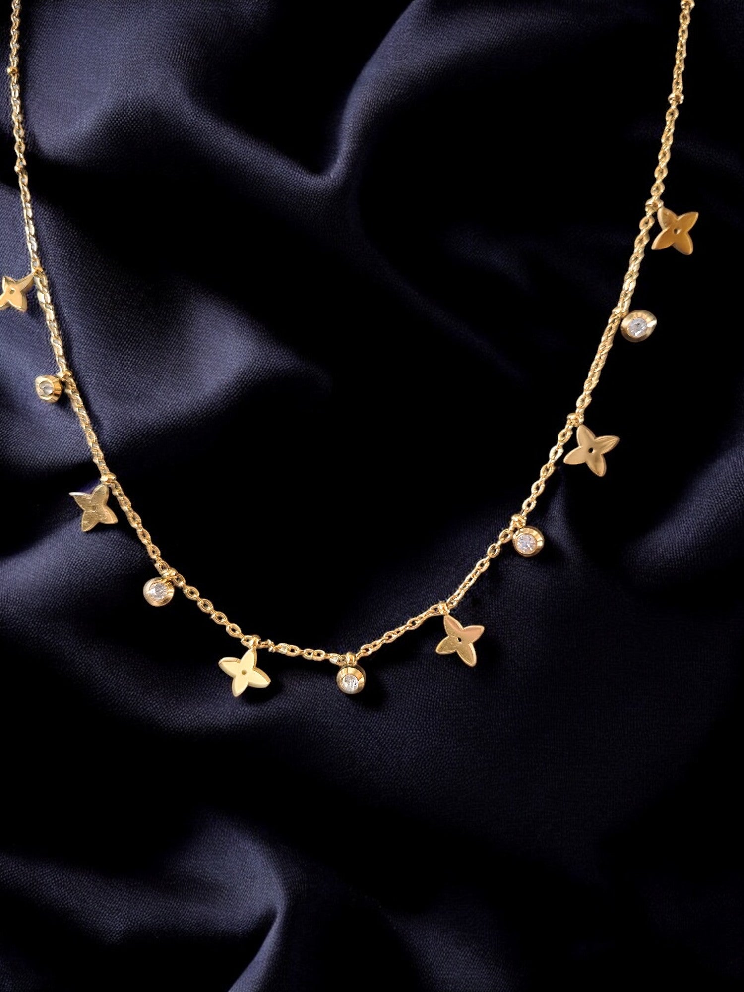 Description: Twilight Dust features a petite star charm floating among soft diamond shimmer — like a clear night sky captured in gold. A whisper of celestial beauty for dreamers and stargazers alike.